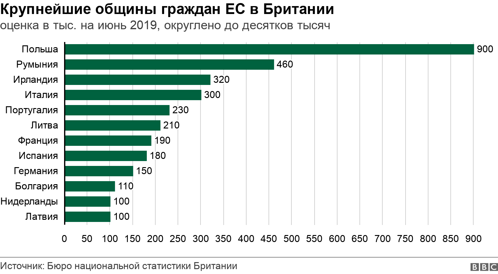 Крупнейшие общины граждан ЕС в Британии. оценка в тыс. на июнь 2019, округлено до десятков тысяч.