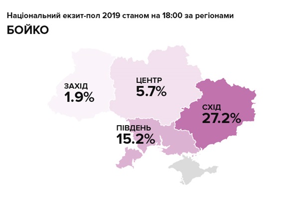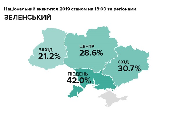 Согласно данным экзит-поллов кандидата в президенты Владимира Зеленского активно поддерживают на Юге и Востоке страны.