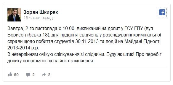 "2 ноября в 10:00 официально вызвали на допрос в ГСУ ГПУ, чтобы дать показания по делу об избиении студентов 30.11.2013 и событий на Майдане Достоинства 2013-2014 года", – написал Шкиряк на своей странице в Facebook.