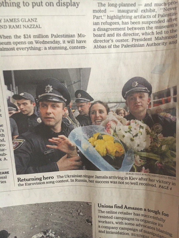 Світова преса продовжує захоплюватися Україною. Так, перша полоса International New York Times присвячена перемозі Джамали на пісенному конкурсі "Євробачення-2016". Американське видання називає це фактором стратегічної перемоги у інформаційній війні.