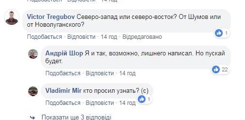 На уточняющий вопрос, где именно это произошло – на северо-западе (поселок Шумы) или северо-востоке (со стороны Новолуганского, т.е. Светлодарской дуги), Шор заметил: "Я и так, возможно, лишнего написал. Но пускай будет".