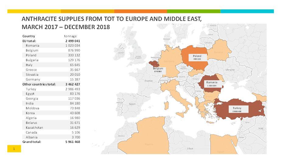 «Европа и Турция — основные потребителя антрацита происхождением из ОРДЛО. Согласно документу, Турция с марта 2017-го по декабрь 2018-го купила почти 3 млн тонн угля этой марки. Второй по объемам оказалась Румыния — 1,02 млн тонн, третьей — Бельгия — 876 990 тонн. За ними следуют Польша (333 132 тонны) и Болгария (129 176 тонн)», — говорится в сообщении.